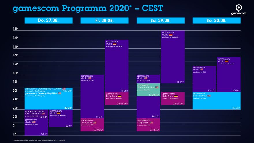 Wer nächste Woche die Zeit hat, den ganzen Tag am PC oder vorm Fernseher zu verbringen, kann sich von Donnerstag bis Sonntag täglich mehrere Stunden an Live-Inhalten anschauen. Ein großer Teil der gamescom 2020 spielt sich schließlich in Livestreams ab. Los geht es am 27. August mit der Opening Night Live. Die fand 2019 zum ersten Mal statt. Damals wie heute ist Geoff Keighley Moderator. Los geht es um 19:30 Uhr mit der Pre-Show, bevor um 20 Uhr die eigentliche Veranstaltung beginnt. Um 21:30 Uhr folgt zunächst eine After-Show und im Anschluss übernimmt das gamescom studio. Das ist eines der täglichen Formate, wobei es zwei Varianten gibt. Die internationale (englische) Version wird von IGN produziert, die deutsche von Webedia (GameStar, Gamepro). Bis 0 Uhr sind die Kollegen am 27. August auf Sendung.